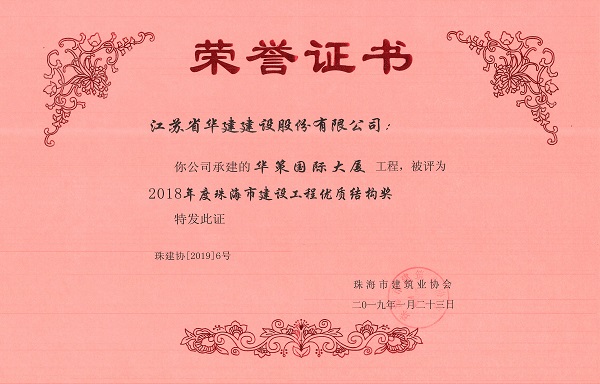 華策國際大廈獲2018年度珠海市建設(shè)工程優(yōu)質(zhì)結(jié)構(gòu)獎
