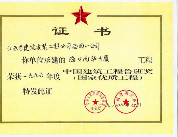 海口市南華大廈工程于1994年5月竣工,1995年6月被評(píng)為海南省優(yōu)質(zhì)樣板工程,1995年12月被評(píng)為建設(shè)部優(yōu)質(zhì)樣板工程,1996年10月榮獲魯班獎(jiǎng)。