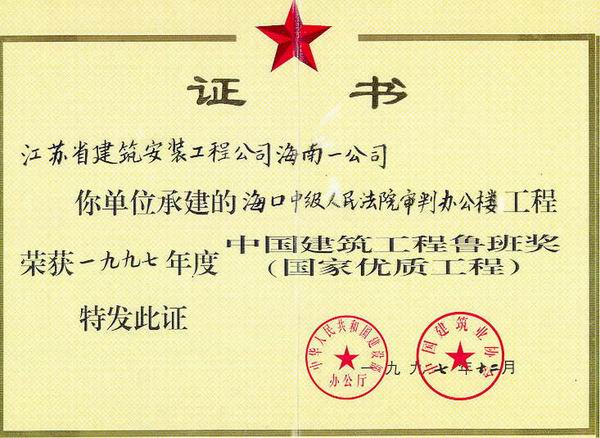 ??谑兄屑?jí)人民法院審判辦公樓位于??谑薪鹩盥?號(hào),1995年4月竣工,1996年6月被評(píng)為海南省優(yōu)質(zhì)工程,并榮獲海南省優(yōu)秀建筑二等獎(jiǎng),1997年12月榮獲魯班獎(jiǎng)。
