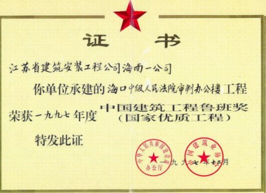 ??谑兄屑?jí)人民法院審判辦公樓位于??谑薪鹩盥?號(hào),1995年4月竣工,1996年6月被評(píng)為海南省優(yōu)質(zhì)工程,并榮獲海南省優(yōu)秀建筑二等獎(jiǎng),1997年12月榮獲1997年度建筑工程魯班獎(jiǎng)。