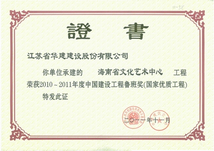 海南省文化藝術(shù)中心(海南省歌舞劇院)是海南省委、省政府在“十一五規(guī)劃” 期間實(shí)施的重點(diǎn)惠民公共文化設(shè)施,是海南文藝繁榮發(fā)展的新座標(biāo)。坐落于海南文化公園中軸線上,工程建筑面積23500平方米,東西長(zhǎng)128米,南北寬113米,高33米,包括可同時(shí)容納1300人的劇場(chǎng)、演出輔助用房、排練房等建筑,建筑造型酷似一只展翅飛翔的大鳥。工程總造價(jià)1.94億元。先后獲得2009年度國家AAA級(jí)安全文明標(biāo)準(zhǔn)化誠信工地、全國優(yōu)秀質(zhì)量管理小組稱號(hào)及全國質(zhì)量信得過班組稱號(hào)等多項(xiàng)榮譽(yù)。通過技術(shù)創(chuàng)新,獲得省級(jí)工法兩項(xiàng)、省級(jí)QC成果兩項(xiàng)、省級(jí)優(yōu)秀技術(shù)論文三篇,被評(píng)為海南省新技術(shù)應(yīng)用示范工程。2011年11月,榮獲2010-2011年度中國建設(shè)工程魯班獎(jiǎng)(國家優(yōu)質(zhì)工程),是公司獲得的第16個(gè)“魯班獎(jiǎng)”項(xiàng)目。