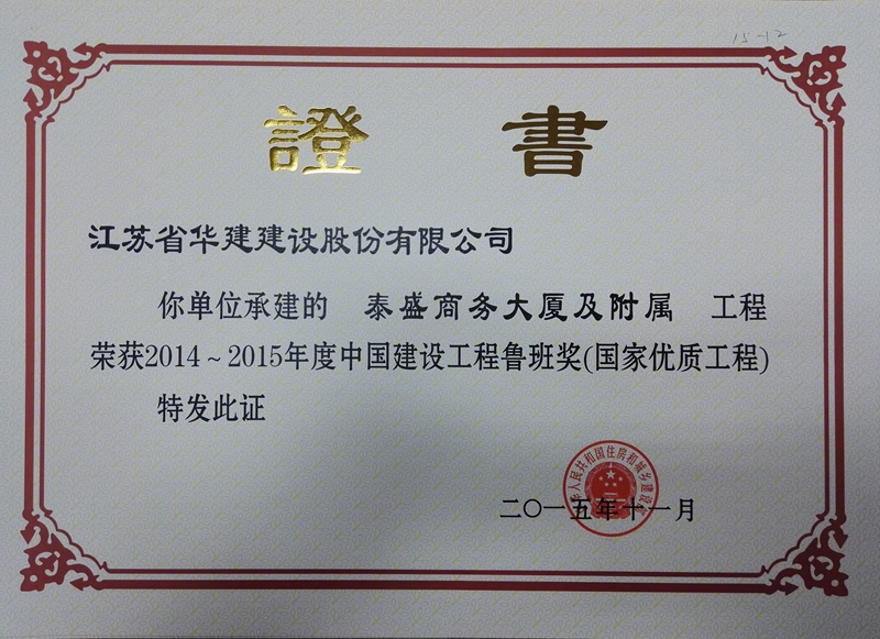 泰盛商務(wù)大廈及附屬工程地處秦皇島市經(jīng)濟(jì)開發(fā)區(qū)核心位置,集商務(wù)辦公、會(huì)議中心、一站式服務(wù)大廳及報(bào)告演藝廳等功能為一體的綜合類商務(wù)辦公樓,地下1層,地上23層,裙樓兩層,建筑面積90148㎡,建筑高度97.75米。工程先后榮獲全國建筑業(yè)綠色施工示范工程、江蘇省新技術(shù)應(yīng)用示范工程、江蘇省省級工法、河北省結(jié)構(gòu)優(yōu)質(zhì)工程獎(jiǎng)、河北省建設(shè)工程安濟(jì)杯獎(jiǎng)(省優(yōu))、全國優(yōu)秀項(xiàng)目管理成果獎(jiǎng)、全國優(yōu)秀QC小組成果一等獎(jiǎng)。2015年,被中建協(xié)評為2014-2015年度中國建設(shè)工程魯班獎(jiǎng)(國家優(yōu)質(zhì)工程)。