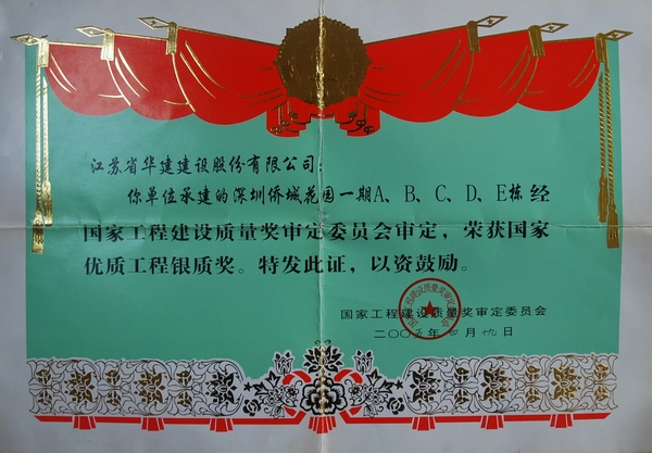 該工程先后榮獲2000年度深圳市雙優(yōu)文明工程稱號(A、B、C棟工程)、2001年度深圳市雙優(yōu)文明工程稱號(D、E棟工程);2003年度江蘇省揚州市“瓊花杯”及江蘇省省外“揚子杯”優(yōu)質(zhì)工程獎(A、B、C棟工程)、2004年度江蘇省揚州市“瓊花杯”及江蘇省省外“揚子杯”優(yōu)質(zhì)工程獎(D、E棟工程);2004年度國家優(yōu)質(zhì)工程銀獎;QC小組課題“墻體清水混凝土質(zhì)量控制”獲得江蘇省一等獎及全國工程建設(shè)優(yōu)秀QC小組獎。