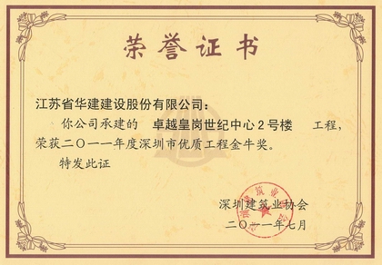 該工程先后被評為深圳市優(yōu)質結構工程、深圳市優(yōu)、“金牛獎”、 廣東省建筑業(yè)新技術應用示范工程、全國AAA級安全文明標準化誠信工地、江蘇省省優(yōu)“揚子杯”和廣東省優(yōu)良樣板工程。