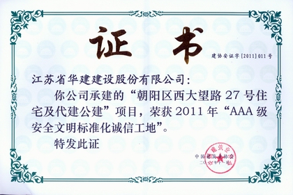 該工程先后榮獲2010年度“北京市文明安全樣板工地”和2011年度全國(guó)“AAA級(jí)安全文明標(biāo)準(zhǔn)化誠(chéng)信工地”榮譽(yù)稱(chēng)號(hào)。